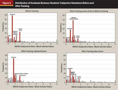 Finally, we asked the students what ESO valuation factors they found important when making their valuations to understand why valuations changed with training. We found that those who relied on simple valuation anchors focused on stock price and exercise price, while those who used more sophisticated valuation methods incorporated more time-value factors into their subjective estimates of value (such as stock price volatility, time to expiration, etc.).