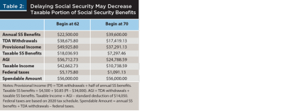 Third, as Reichenstein and Meyer (2018) and Reichenstein (2019) illustrated, many middle-income retirees—both single individuals and married couples filing jointly—can reduce the taxable amount of their Social Security benefits by delaying the beginning of those benefits. Table 2 illustrates this logic for a single individual, but the same logic applies to married couples.