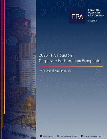 At FPA of Houston, we are proud to work with a variety of companies and organizations within the industry that we consider true partners. Together, we are committed to providing financial planners with the tools, resources and experiences they need to thrive and be the best they can be. Companies that support the growth of the financial planning profession, share our values, and want to do impactful work alongside FPA should consider a partnership with the Houston chapter. Partnerships are year-long relationships built upon mutual goals. There are multiple levels of partnership, each offering high-impact benefits and opportunities. We appreciate your interest in partnering with the FPA of Houston and hope to work with you.