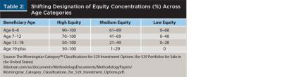One way to help the next generation with the increasing cost of education is the Section 529 college savings plan. Age-based 529 portfolios, which increase the debt allocation as a beneficiary approaches college, are a popular way to address the changing utility function (e.g., replacing a desire for returns with one of safety) over time. After setting aside money for these plans, investors confront a series of critical issues regarding 529 portfolio equity allocation and costs. Equity allocation is arguably important with 529 portfolios because there are a limited number of years before the child starts drawing on these funds—a situation in which one could argue for higher equity concentrations. However, there are also few years for a 529 portfolio to recover from a market decline. Investors have choices of high, medium, or low underlying equity concentrations at any beneficiary age.