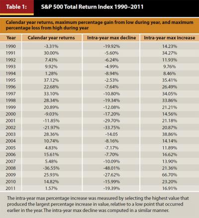 To understand just how much the annual standard deviation of returns masks the amount of volatility that investors actually experience, consider the following statistics using the S&P 500 Total Return Index (SPX) as an example. In Table 1 and Figure 4, the calendar year return measures the change in the S&P 500 Total Return Index from January 1 to December 31. The intra-year maximum decline is the maximum percentage loss an investor experienced during the year, measured between whatever two points during the year produced the largest loss, while always moving forward in time. Thus, the period associated with that loss varies from year to year. The intra-year maximum increase is the maximum percentage gain during the year, measured using a methodology equivalent to the methodology used to determine the maximum decline. The average annual standard deviation of returns was 18.5 percent. It is easy to see the range covered by the maximum decline to maximum increase during most years far exceeded 1 average standard deviation. Small wonder that some individual investors have trouble sleeping at night.