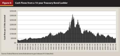 Figure 4 demonstrates the historical cash flows that a 10-year bond ladder using zero coupon Treasuries would have produced. Each bar represents the interest that would have been earned on a $100 zero coupon Treasury investment 10 years prior. Each month when a bond matures, the initial $100 principal was assumed to be reinvested and the accrued interest was assumed to be spent. It was further assumed that 120 bonds were held in the bond ladder.