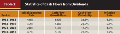 Table 2 shows how cash flows generated from dividends varied over the historical period analyzed. These data produce several notable observations. First, the level of cash flow coming from dividends varied with the period analyzed. For example, the starting cash flow in the 1983–2013 period was nearly twice the starting cash flow compared to the 1973–2003 period. Second, the cash flows coming from dividends over these periods have outpaced inflation. This means that relative to an inflation-adjusted cash flow targets, the cash flows grew at a faster pace. Finally, the cash flow variability5 from month to month and year to year was material. For a retiree with bills that do not fluctuate, this kind of volatility in a cash flow stream is likely undesirable.