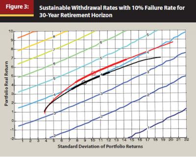 Figure 3 shows the efficient frontier with these Table 4 assumptions in black along with the efficient frontier for the Table 1 historical data in red. For this particular hypothetical example, the asset allocation that supports the highest withdrawal rate over 30 years with a 10 percent failure rate is 12.5 percent U.S. stocks, 16.7 percent U.S. REITs, 18.4 percent international stocks, 52.4 percent U.S. bonds, and no Treasury bills. This asset allocation supports a 4.0 percent withdrawal rate. If deemed acceptable, this could serve as the client’s withdrawal rate and asset allocation strategy.
