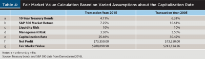 Table 4 illustrates two valuations using the income approach based on 2015 and 2005 factors. Because the market return and long-term risk-free rate were both lower in 2015, there was a lower FMV of practices. Hence, the timing and the overall health of the economy plays a critical role if an owner of a practice desires a higher FMV.