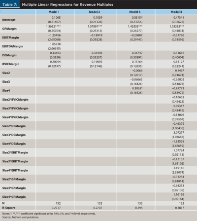 Practice owners could use Table 7 to predict the selling revenue multiple to a certain degree. Without the value driver adjustments explained earlier, such as the quality of the clients, the team, and the platform, it is not a complete revenue multiple prediction. However, Table 7 can provide direction for which financial statement items practice owners may wish to focus on, such as gross profit, EBIT, etc., in their business model to best predict the selling revenue multiple. Practice owners have control of their financial statement items; they can reduce costs as well as increase the operating income or EBIT.