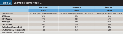 Table 8 uses model 3 to illustrate examples of three practices. Practice A has less than $500,000 revenue or GDC, 70 percent gross profit margin (GPMargin), 11 percent earnings before interest and taxes margin (EBITMargin), 27 percent discretionary earnings margin (DEMargin), and 5 percent book value of invested capital margin (BVICMargin). Recall that the dataset used in this analysis is primarily used by generalists. When you plug in the explanatory variables for Practice A into model 3, the revenue multiple is 1.11. However, because a generalist’s multiple is 34.09 percent less than a specialist’s, as explained earlier, the estimated specialist’s revenue multiple would be 1.68.