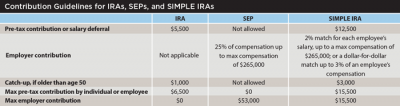 Contribution limits and allowable contributions differ dramatically between traditional and Roth IRAs, SEPs, and SIMPLE IRAs. SEPs operate like profit-sharing plans allowing only employer contributions. SIMPLE IRAs are more like 401(k) plans, allowing salary deferrals and company matches. The table on page 37 illustrates current contribution guidelines.
