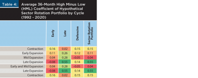 - During contractions, the portfolio would be invested in defensive sectors. During this time, the portfolio would end up being tilted towards value, but to a much smaller extent compared to the late stage of the cycle. The average trailing 36-month HML coefficient of the portfolio during contractions was 0.15.