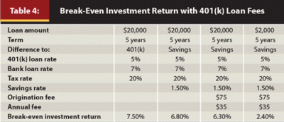 The effect of fees on the break-even investment return is presented in Table 4. A $20,000 loan with a market rate of 7 percent has a 7.5 percent break-even investment return when the difference is contributed to a 401(k). The break-even falls to 6.8 percent when the difference is invested in a savings account. If a $75 origination fee and a $35 annual maintenance fee are included, the break-even falls to 6.3 percent. Drop the loan amount to $2,000 and the break-even falls to 2.4 percent. A combination of 401(k) loan fees and small loan size dramatically reduces the appeal of 401(k) loans.3