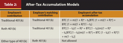 The analyses were also premised on the assumption that the employee will contribute the same after-tax amount, which means that the model compared a Roth 401(k) contribution to an appropriately larger traditional 401(k) contribution. It was further assumed that the employee invests the current tax savings arising from a traditional 401(k) contribution, and this invested amount grows and is available to cover some or all of the future tax liability arising from a traditional 401(k) distribution. The analyses could have been structured differently so that the employee consumes the current tax savings arising from a traditional 401(k) contribution, but such an analysis would be comparing dissimilar after-tax contributions. A financial planner can help an employee understand this distinction.