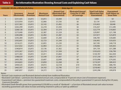 Disclosure of life insurance, like that of virtually any financial product, has fundamentally been a two-step process: (1) provide a description of how the product or illustration works, and (2) provide performance information so that one can assess and search for competitive performance. The informative illustration shown in Table 2 achieves the first step. Tables 3 and 4 provide examples of some of the necessary performance information to complete the second step.