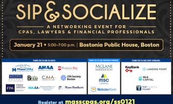 MassCPAs invites you to Sip & Socialize with fellow CPAs, lawyers and financial professionals who can help take your career to the next level. We know you’re busy, and this dedicated event will connect experienced professionals from across industries.