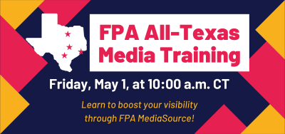 At the FPA All-Texas Media Training on May 1 at 10 a.m. CT, you’ll learn how to maximize FPA MediaSource, respond to journalist queries with confidence, and position yourself as a go-to expert. You’ll also hear from a panel of Texas members who are already turning FPA MediaSource opportunities into real press wins…and how you can do the same. Register now to join us!