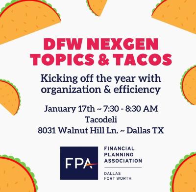 Join DFW NexGen at Tacodeli for Topics & Tacos: Kicking off the Year with Organization and Efficiency. We’ll discuss favorite strategies, software, apps, books, etc. for working efficiently and staying organized since we all know how easily things can get chaotic in our industry! Breakfast tacos and beverages will be available for purchase.
