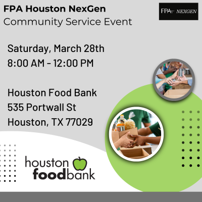 Date Sat, Mar 28, 2026 8:00 AM - 12:00 PM Location Houston Food Bank 535 Portwall St, Houston, TX 77029 Affiliated chapters FPA of Houston