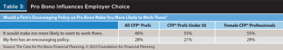 FFP’s research also showed that when advisory firms support and encourage their advisers to do pro bono work, they can gain a competitive advantage in the war for next-gen talent. Fifty-five percent of CFP® professionals under the age of 35 said that they would be more likely to go work at a firm that had an encouraging policy on pro bono for its advisers—but only 21 percent said that their current firm did, a whopping 34-point gap that cutting-edge firms can leverage if they adopt more supportive policies and practices. See Table 3.